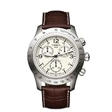 Stainless steel case. Brown leather strap with contrast stitching. Cream dial. Date displays at 6 o'clock position. Chronograph. Tachymeter. Scratch resistant sapphire crystal. Tang clasp. Case diameter 43mm. Case thickness 10mm. Quartz movement. Water resistant at 100 meters (330 feet). Alternate model number T36131672. Tissot V8 Steel Chronograph Brown Mens Watch T36.1.316.72